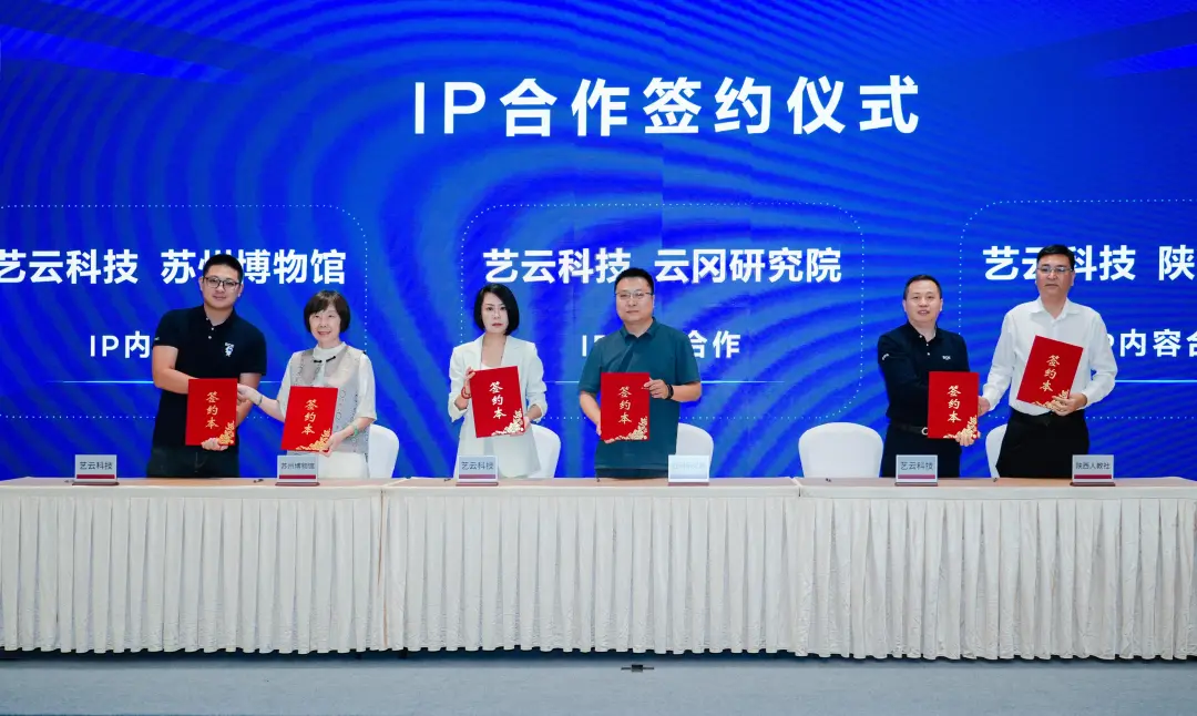艺云科技分别与苏州博物馆、云冈研究院、陕西人民教育出版社签约,针对馆藏文化、文物保护、教育内容等领域的文化IP开展科技化开发与传播;与河南省文化产业投资有限责任公司、陕西文旅控股有限公司、资阳文化旅游发展集团有限公司签约,在文旅资源开发、文创产品打造等领域深度联动;与大连博涛文化科技股份有限公司、中国电子国际经济合作公司、瑞安市融媒体中心、京彩石榴籽(北京)文化科技有限责任公司签约,在科技研发、国际合作、传媒传播、文化创作等领域跨界联动;与北教智学数据科技(北京)有限公司、大理州医投管理有限公司、四川省妇女儿童中心签约,开展多维度创新合作。