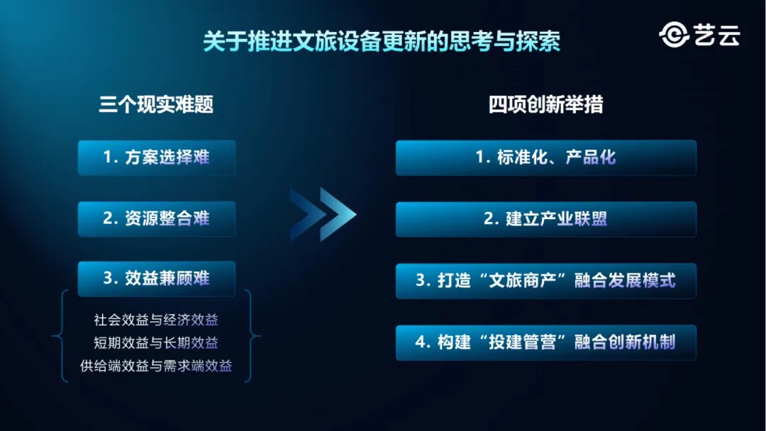 高质量发展关键在于创新。艺云科技对症下药,实施标准化和产品化、建立产业联盟、打造“文旅商产”融合发展模式和构建“投建管营”融合创新机制四项创新举措。