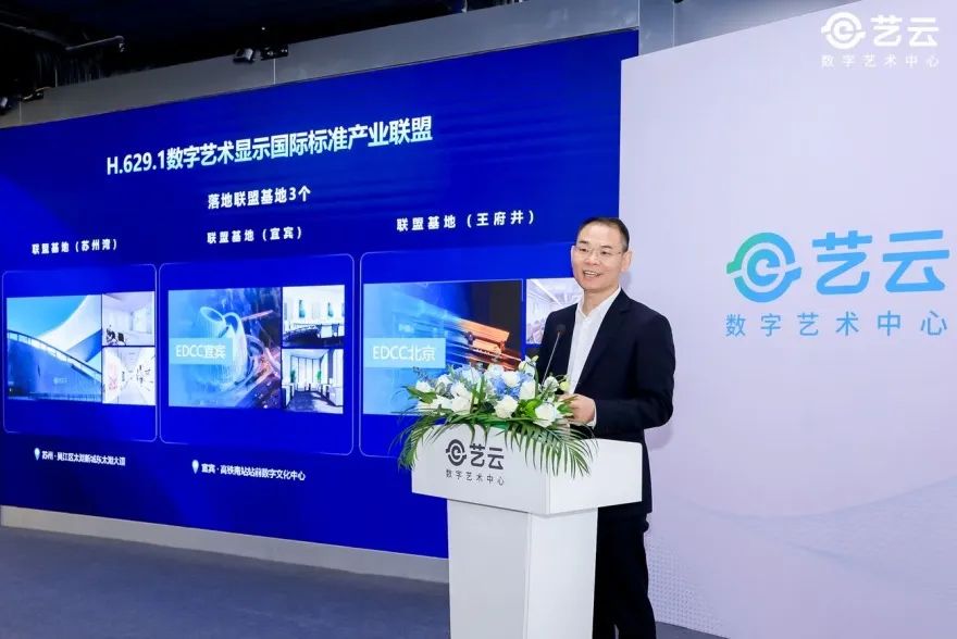 基地落成仪式上,H.629.1 数字艺术显示国际标准产业联盟理事长、京东方科技集团执行副总裁、艺云科技董事长姚项军在致辞中表示:“为促进联盟成员的合作交流和协同创新,我们已在苏州湾数字艺术馆和艺云数字艺术中心(宜宾)内落地了两个联盟基地。北京是全国文化中心,联盟基地能在北京、在王府井落地,对于联盟发展有着特殊意义,期待各位联盟伙伴能利用好联盟基地平台,多交流合作,多出创新成果。”