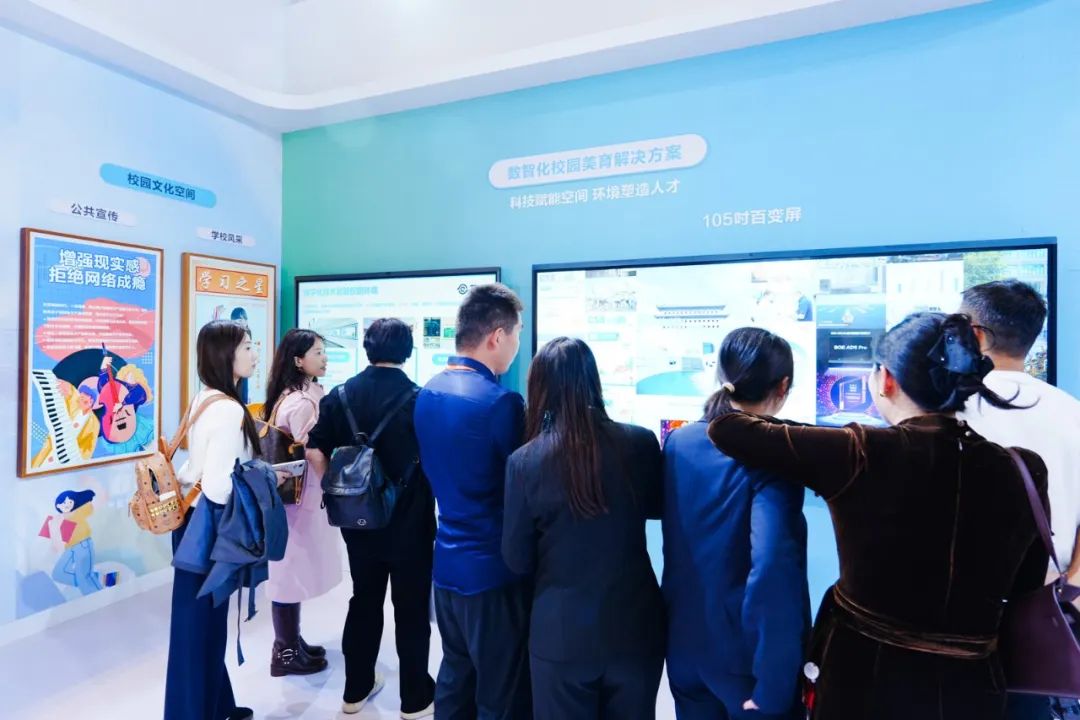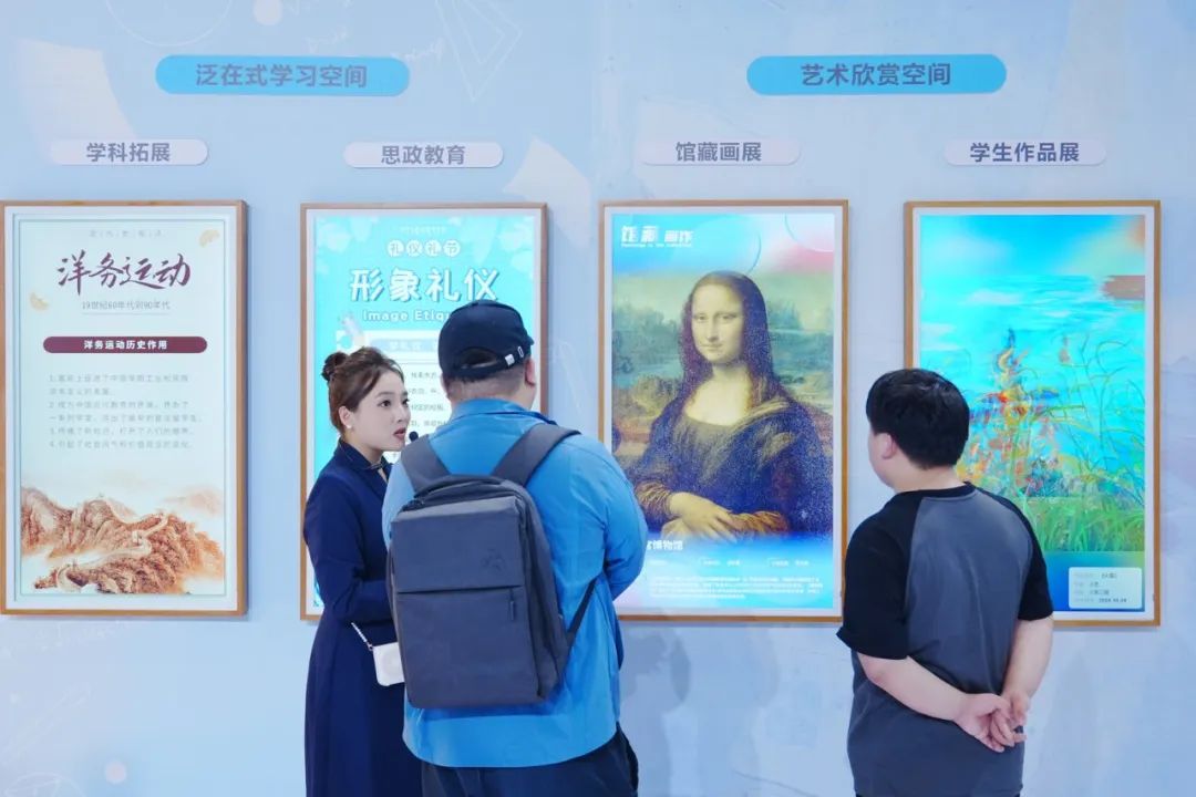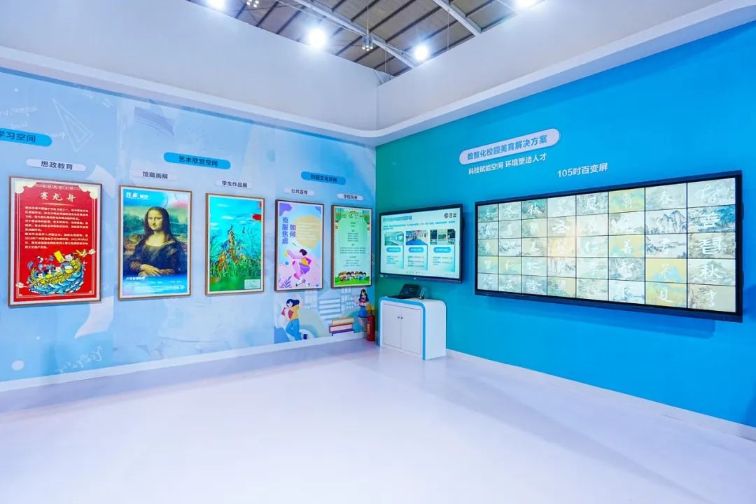艺云科技的数智化校园美育解决⽅案同样吸引了众多目光。方案在学校大厅、走廊、教室等场景构建泛在式学习空间、校园文化空间及班级文化空间,提升校园环境、充分发挥校园空间的育人作用,让校园成为滋养学生心灵与精神的沃土。